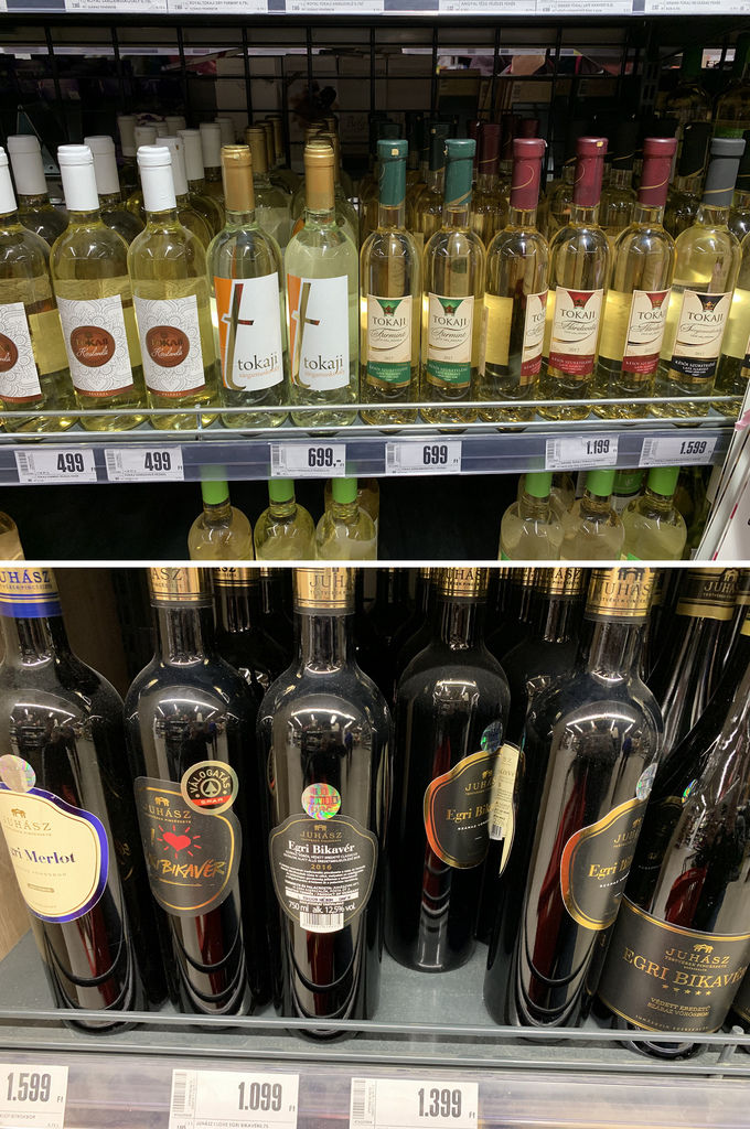↓超市貨架上就買的到的夢幻逸品。貴腐甜白酒(Tokaji)換算約台幣60~70元;公牛血紅酒(Egri Bikaver)換算約為台幣150元左右,不僅酒款夢幻,價格也是夢幻的。