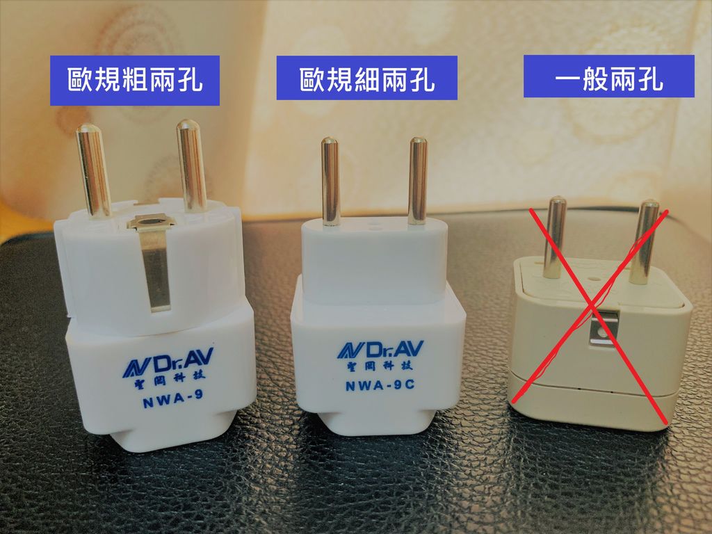 這三個國家是使用歐規的二孔插頭,市面兩孔規格的轉接頭有三種,歐規兩粗兩孔、歐規細兩孔、一般兩孔。依我實際使用的經驗,除了一般兩孔連插都插不進去以外,其他兩種歐規無論粗細都可以使用。