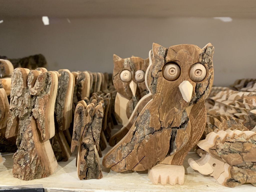 ↓這家店主打木製品(店名我也忘了),店裡面有許多木製的特色商品,連書籤都是木頭做的。我自己很喜歡這個樹皮做的貓頭鷹跟刺蝟。