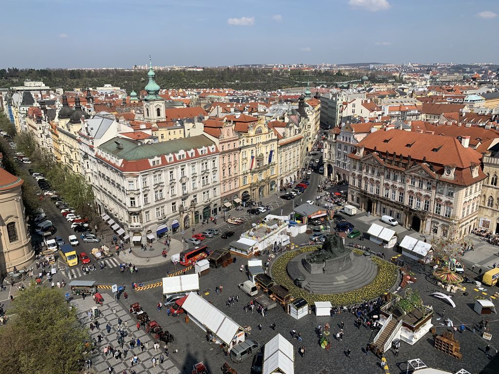 廣場區有許多露天咖啡座、各種熟食的攤販及各具風格的文創品攤位,配合觀光客的來來往往,交織呈現出舊城廣場蓬勃的生命力。知名景點胡斯雕像、天文鐘、舊市政廳、泰恩教堂也就坐落在廣場的四周。