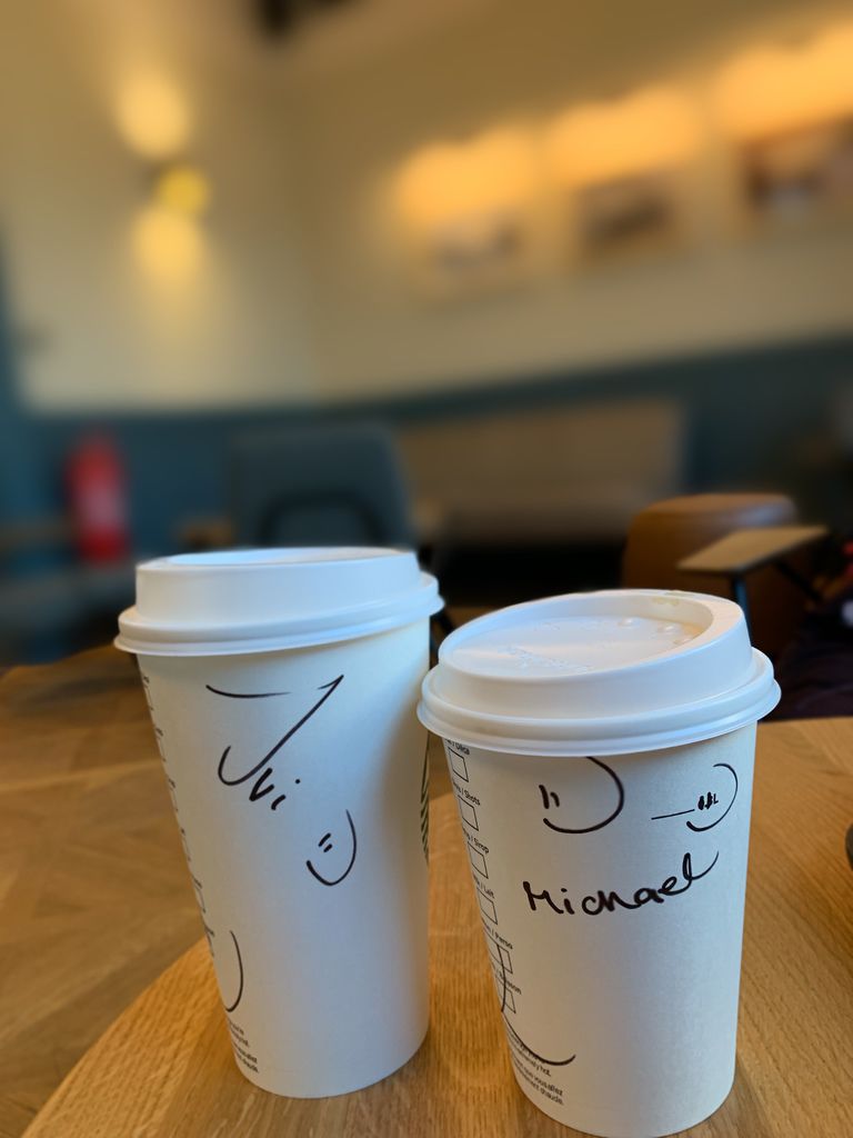 觀察四周,餐廳幾乎都還沒營業,只有兩家星巴克已經亮著燈光。雖然出國有千百個不願意吃麥當勞或星巴克,但當下好像也沒其他選擇,就選擇到天文鐘對面的那間星巴克,沒想到的是…連在星巴克都有小確幸。
