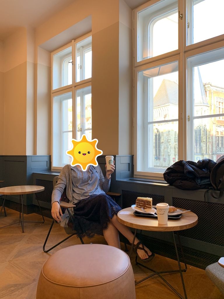平常人滿為患一位難求的星巴克,這時候並沒幾個客人,所有的座位都任我挑選,而我一上到三樓馬上就被一個閃著金黃色光芒的位置給吸引住😮,一個三樓靠窗正對天文鐘的位置正在對我招手。於是乎,當天文鐘整點報時的時候,大家在外面人擠人,我只花一杯咖啡的錢卻能手拿咖啡、翹著腳、眼泛淚光(是感動)的也看著同樣的景色😈。
