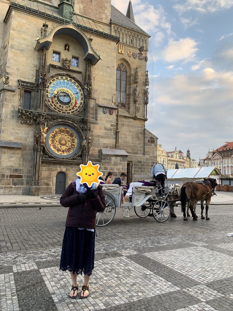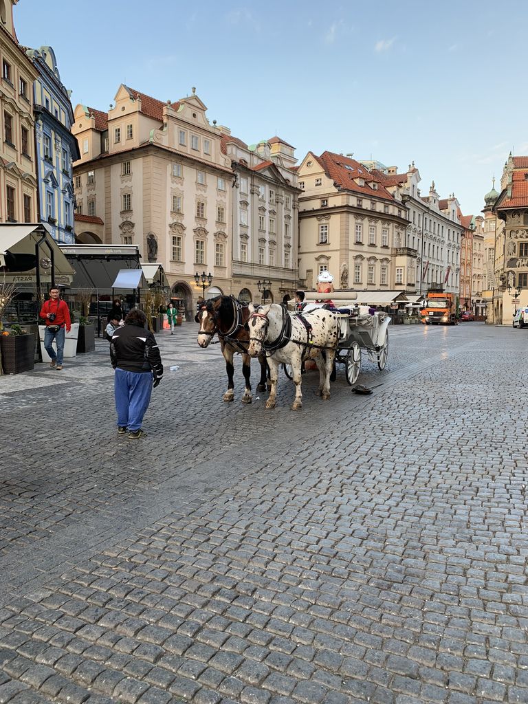 當天早晨的廣場有著微涼的氣溫、清新且乾燥的空氣;已不存在吵雜的人聲,取而代之的是清脆悅耳的鳥叫聲;藍天、白雲及晨曦在天空上以完美的比例呈現著。當天廣場人很少,有一些晨跑的人、一些清潔人員、一些天文鐘前拍照的觀光客、還有兩匹馬😲…甚麼~~真的假的,怎麼我查的資料都沒有提到舊城廣場有馬。沒錯,真的有馬,但其實是一對強國的新人一大早就來拍婚紗,漬漬漬~~強國就是強國,連馬都能弄來😏。
