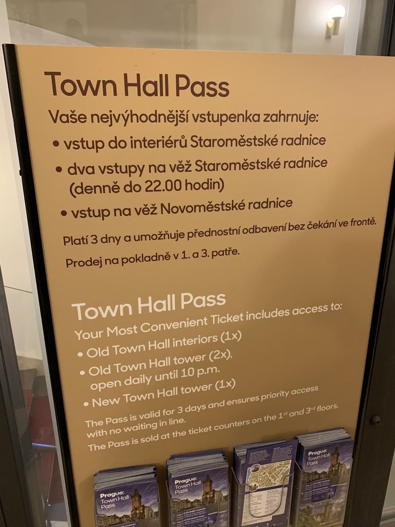 舊市政廳及鐘樓的入口就在天文鐘旁邊的一棟紅色建築物內。這個景點最主要的重點就是要上到69.5公尺高的鐘樓,鐘樓是俯瞰整個舊城廣場的最佳位置。