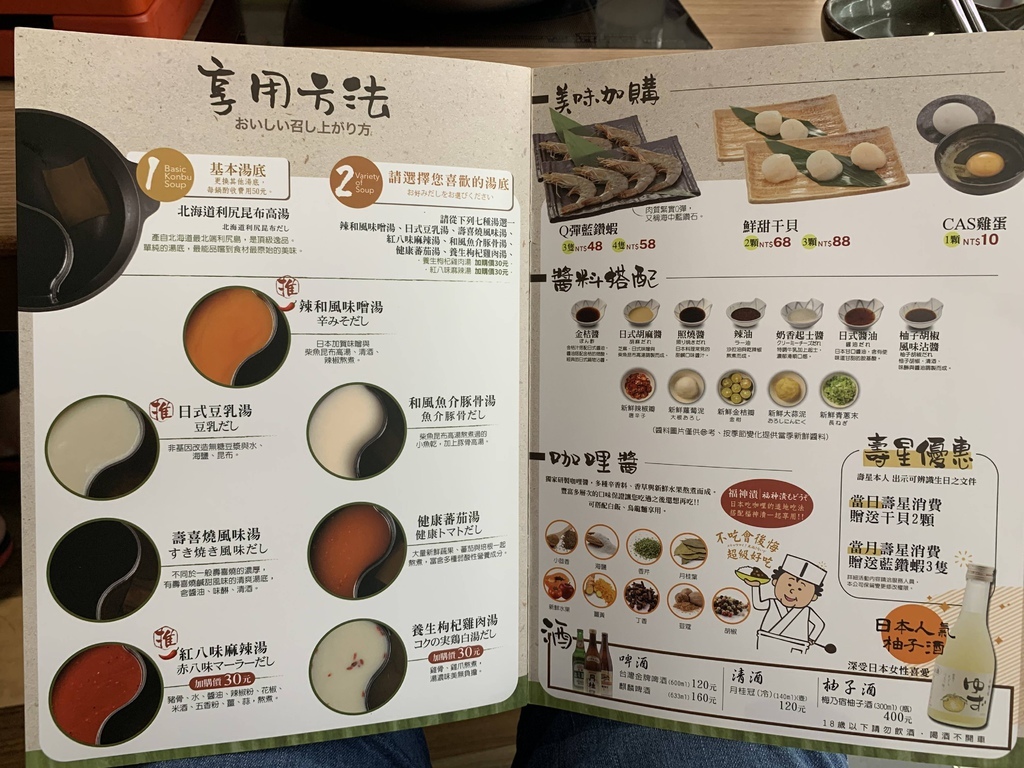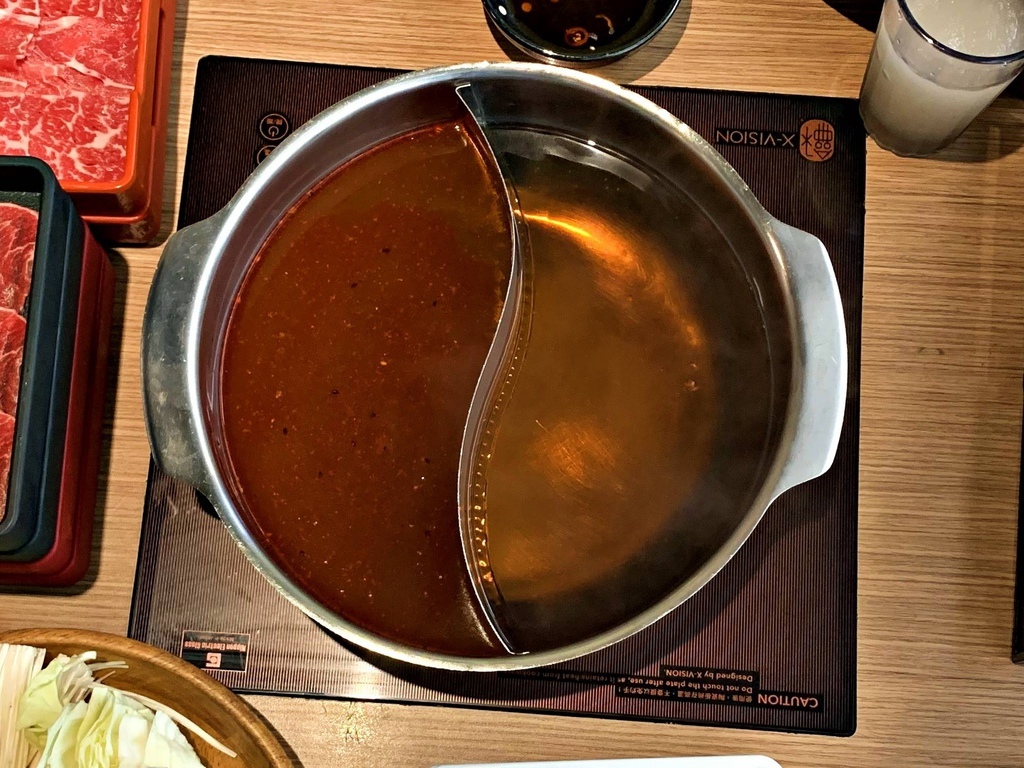 我們這次選的是壽喜燒風味湯跟紅八味麻辣湯(這個是菜單上的推薦,而且要加價$30),加上我之前在別家店選過北海道利尻昆布高湯。我覺得,他們家的湯頭⋯真的很不怎樣⋯。