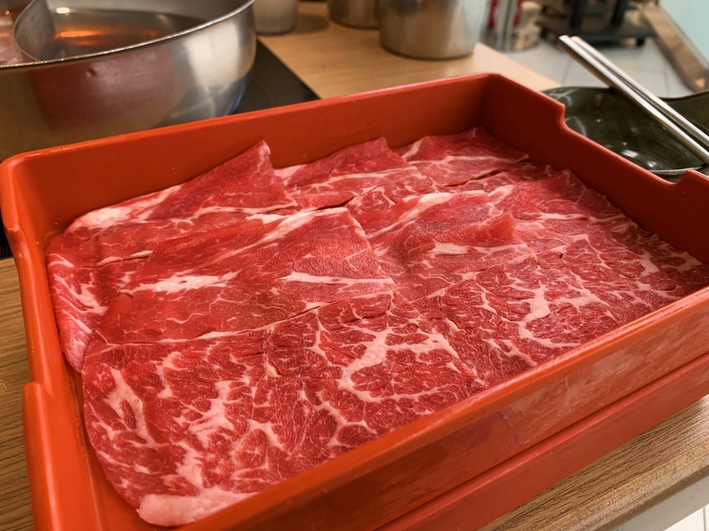 ↓安格斯黑毛五花牛肉(暗紅色肉盤)。以各種肉類來說,我最喜歡他們家的安格斯牛,這個牛五花的油花入口散發甜甜的味道,而且因為是五花部位,所以肉質細緻。