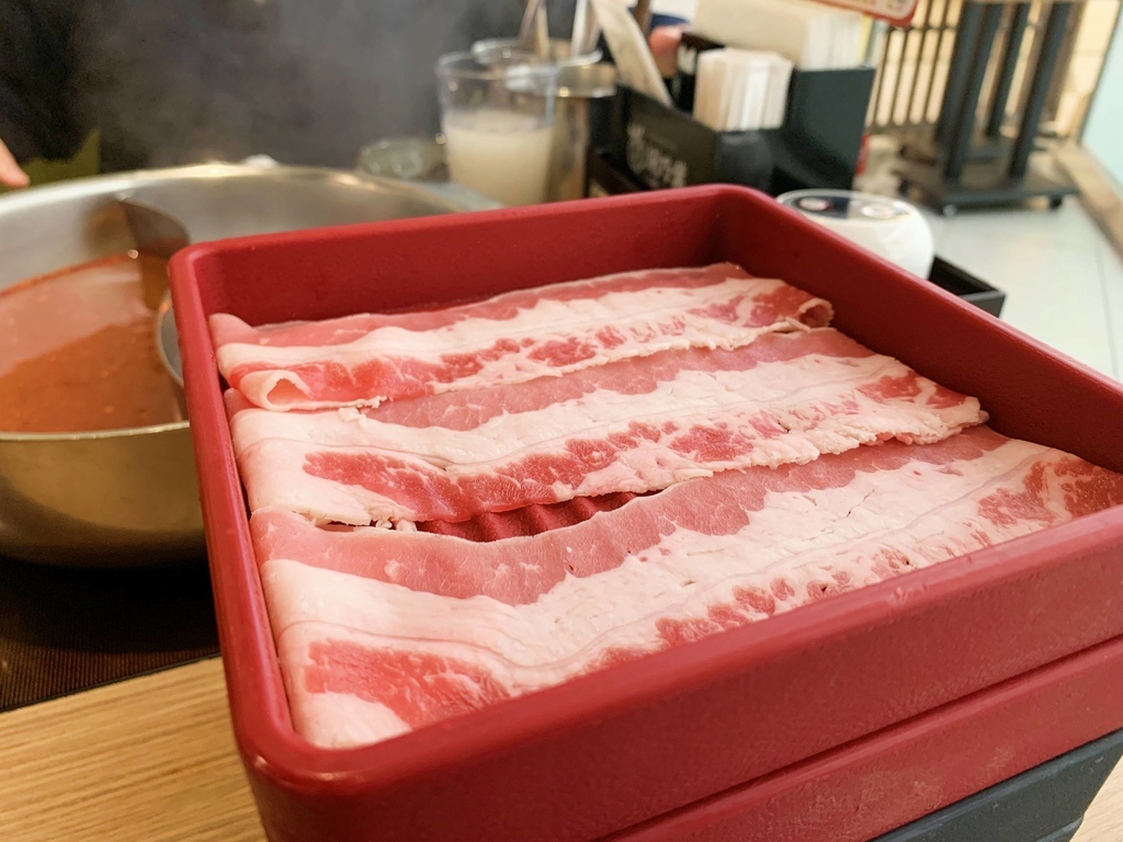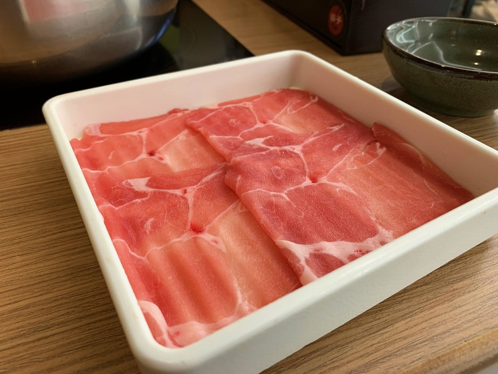 接下來是網路上蠻多人討論的豬肉,有網友推薦來涮乃葉就是要來吃它們家的豬肉,認為午餐時段花$378來吃雞豬套餐的CP值最高。不過我自己偏愛牛肉,所以豬肉就吃個幾口,評測一下而已。