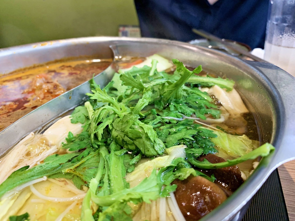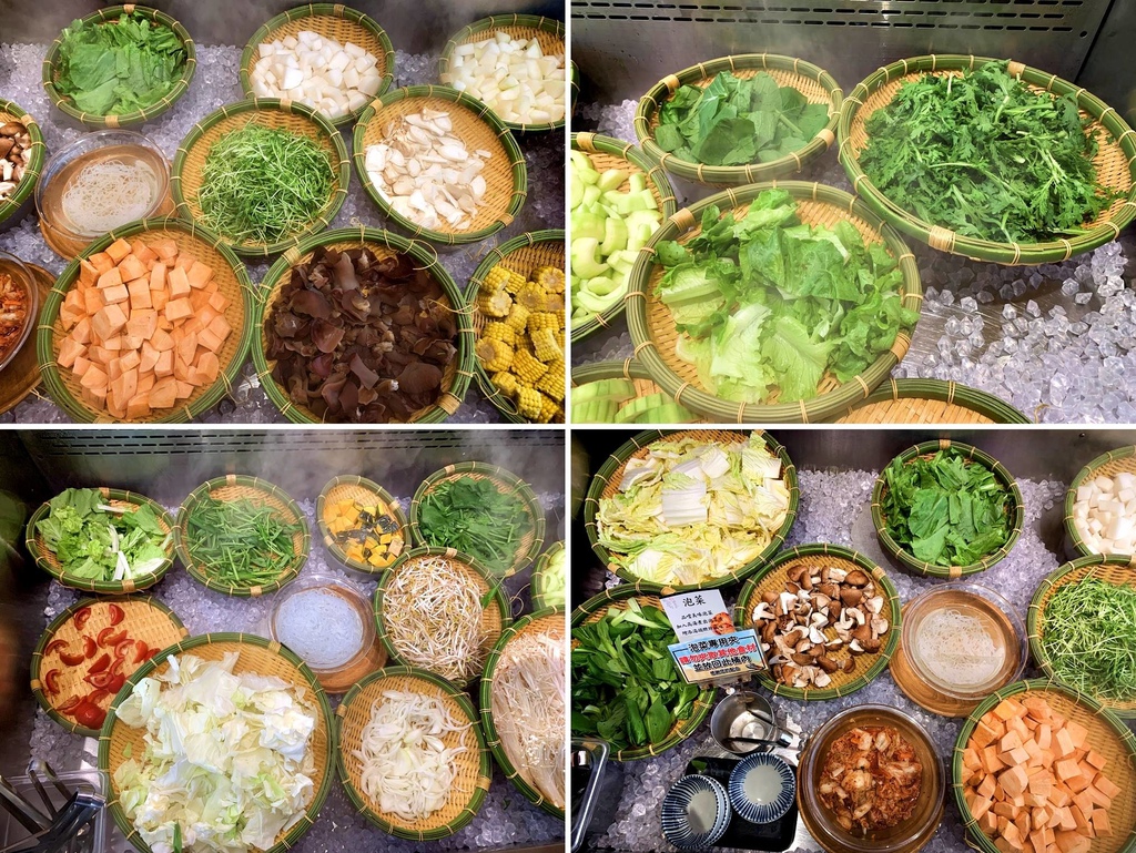 火鍋食材大概就跟涮乃葉官網上的理念一樣,幾乎都是生鮮蔬菜等原型食物,快速念過去,有泡菜、山茼蒿、白菜、番茄、高麗菜、空心菜、葛粉條、洋蔥、南瓜、金針菇豆芽菜、板豆腐、地瓜葉、冬瓜、玉米、木耳、大黃瓜、菠菜、福山萵苣、絲瓜、油菜、青江菜、生香菇、豆苗、蒟蒻、A菜…希望沒漏掉。