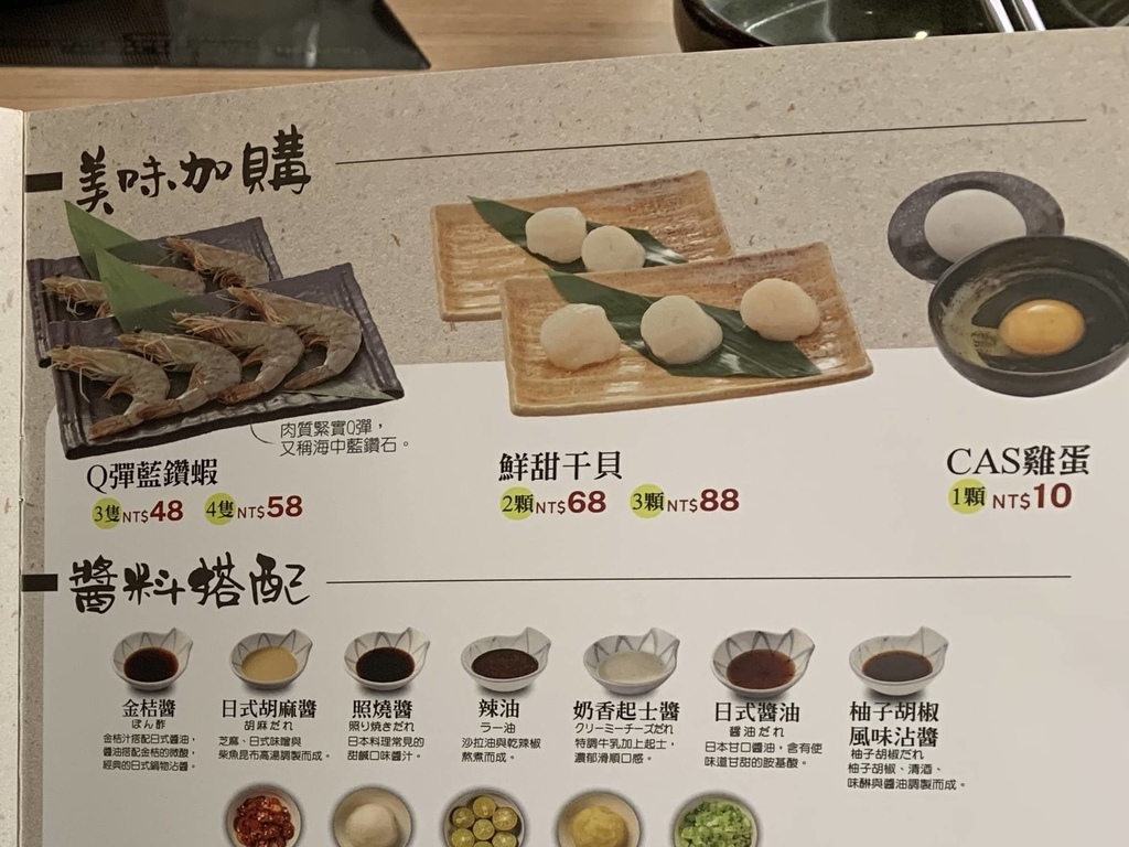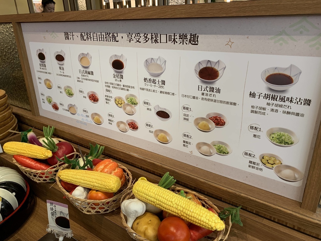涮乃葉提供蠻多種醬料的(有白醋、金桔醬、日式胡麻醬、照燒醬、辣油、奶香起士醬、日式醬油、柚子胡椒風味沾醬、鮮辣椒、蘿蔔泥、鮮金桔、大蒜泥、蔥末),而且還有教你怎麼把這些沾醬互相調配做變化。