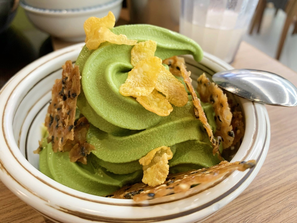 ↓霜淇淋。這個也好吃,尤其是抹茶口味的,抹茶及牛奶的味道都夠濃,搭配餐廳給的一些配料,配的好的話,不輸給外面餐廳賣的。