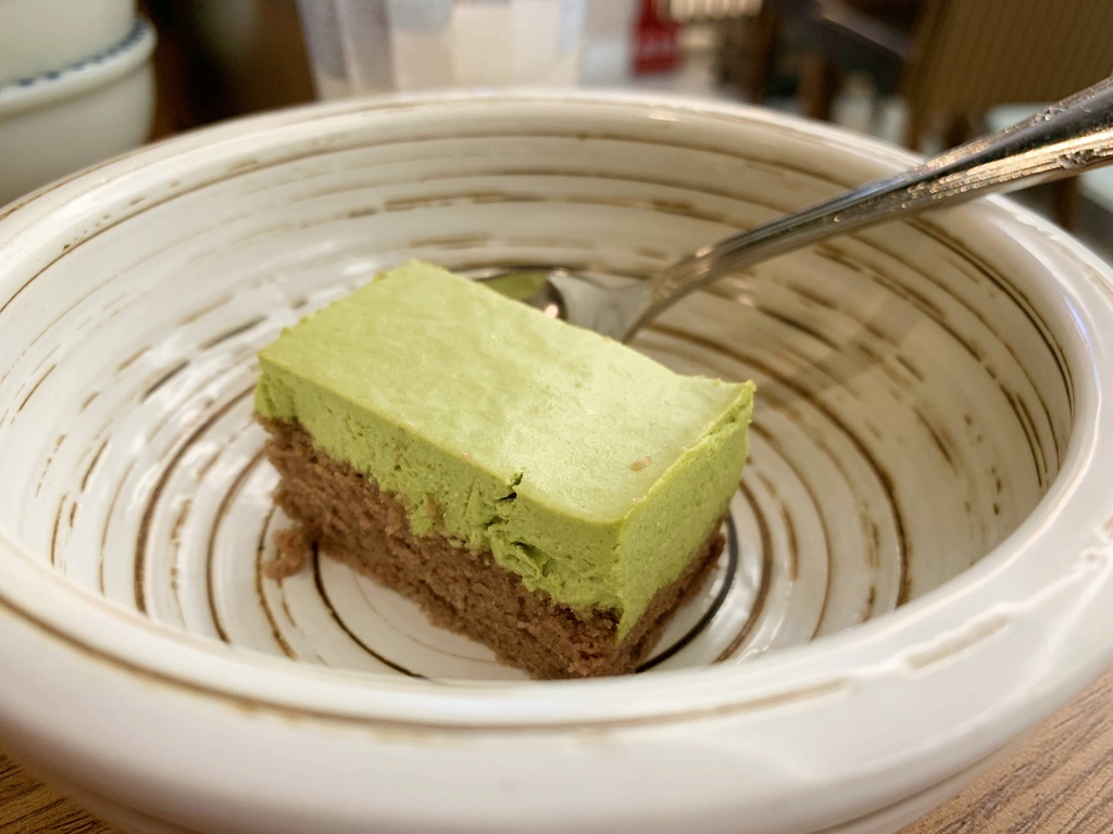 ↓抹茶蛋糕。是巧克力蛋糕體加上抹茶慕斯,嘴裡同時能感受到慕斯的綿密混和蛋糕體粗糙的口感,而且抹茶口味相當濃郁好吃