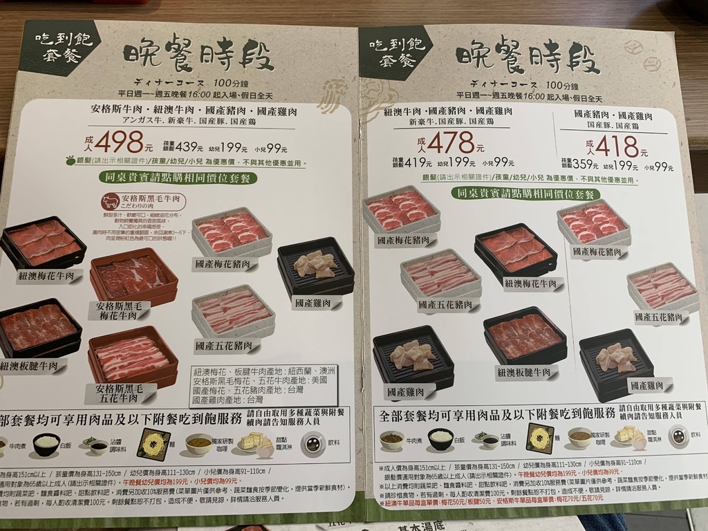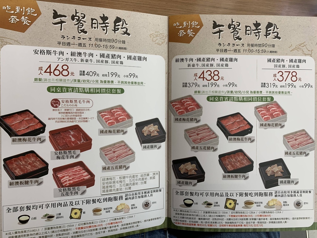 依據不同的用餐時段及不同的肉類選擇有不同的價格。而用餐時間午餐是90分鐘、假日是100分鐘,我自己是覺得吃得有點趕啦~