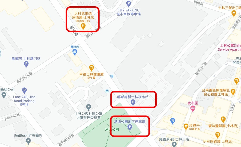 如果是開車來的話,這邊大大小小的收費停車場蠻多的,兩個比較大型的,承德公園地下停車場,這個比較便宜但比較常滿位;另一個是居酒屋旁的嘟嘟房士林夜市站停車場 ,這個停車場空位比較多,不過假日的收費不便宜。