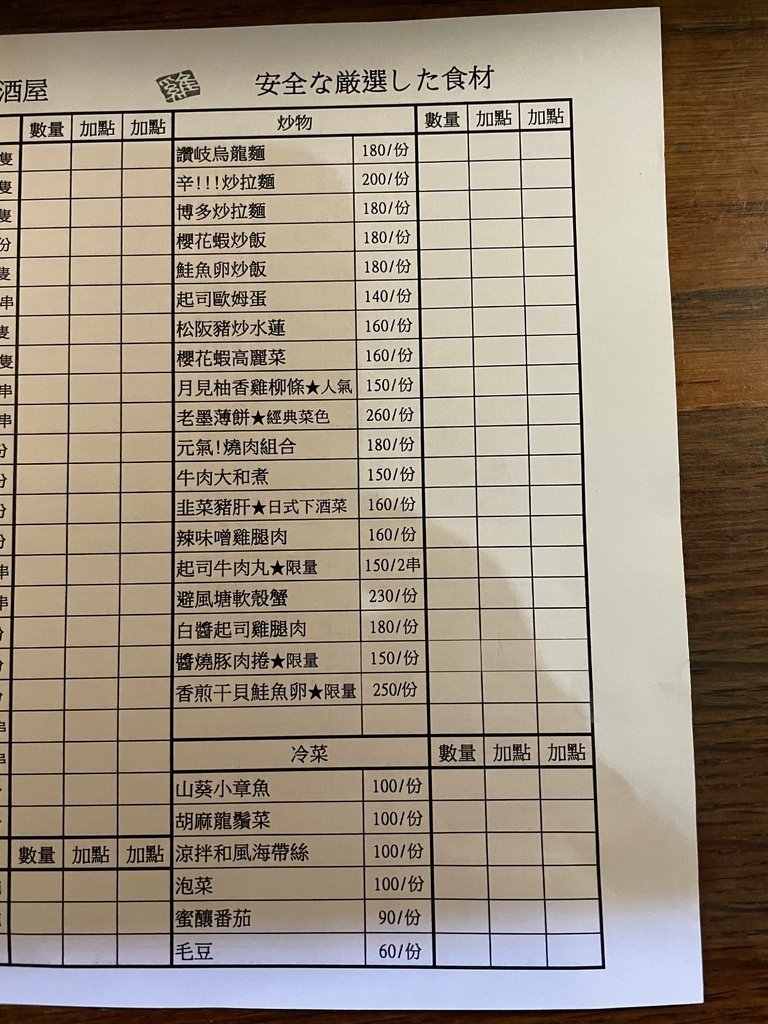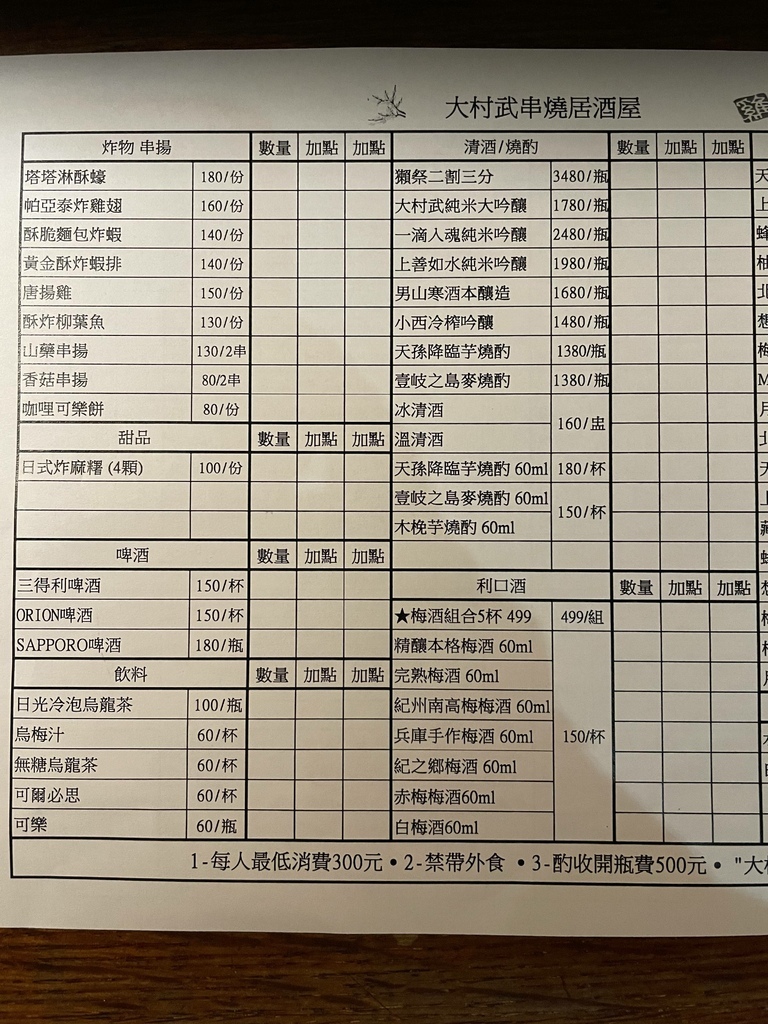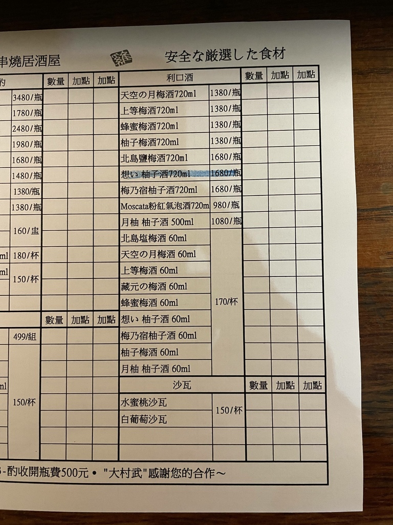 ↓菜單。我覺得因為大村武的東西算精緻,所以整體價位不算低,建議點些可以吃飽的炒飯及麵類主食,再搭配些串燒下酒菜,會比較划算。