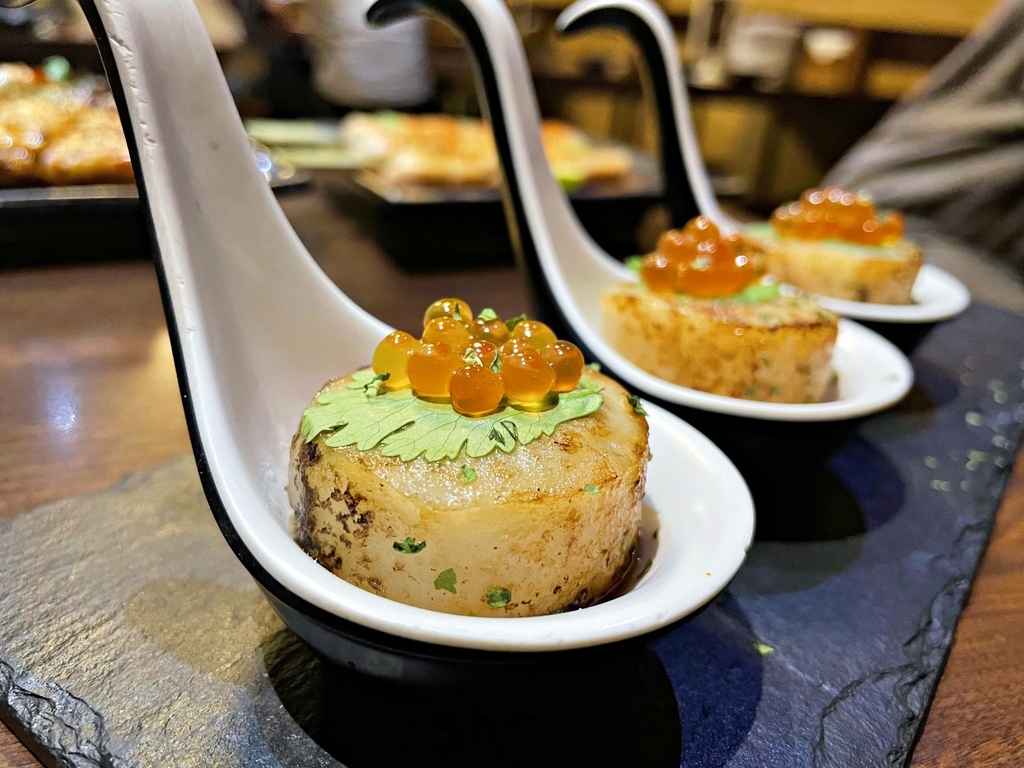 ↓香煎干貝鮭魚卵$250。這一道應該可以算是我今天最喜歡的一道了,一份裡面有四顆干貝。干貝不只分量足,新鮮度完全吃得出來,在吱吱作響的煎台上料理得恰到好處的干貝,一到嘴裡就能感受的到鮮甜的海味,搭配同樣來自大海的鮭魚卵,相得益彰。這一道,我還在拍照的時候,Ivy就不斷地問我,可以吃了嗎? 可以吃了嗎?......。