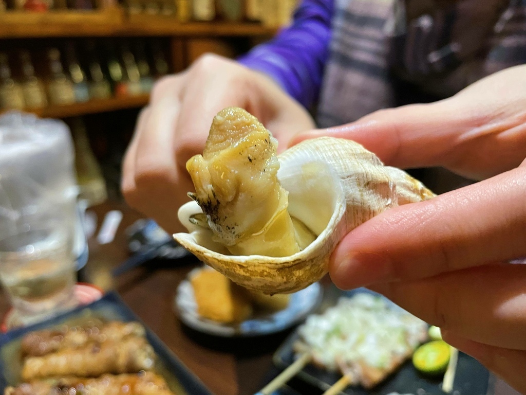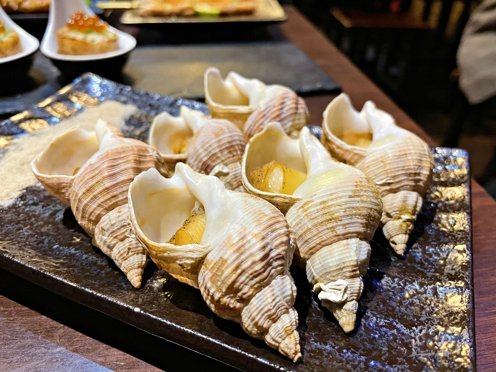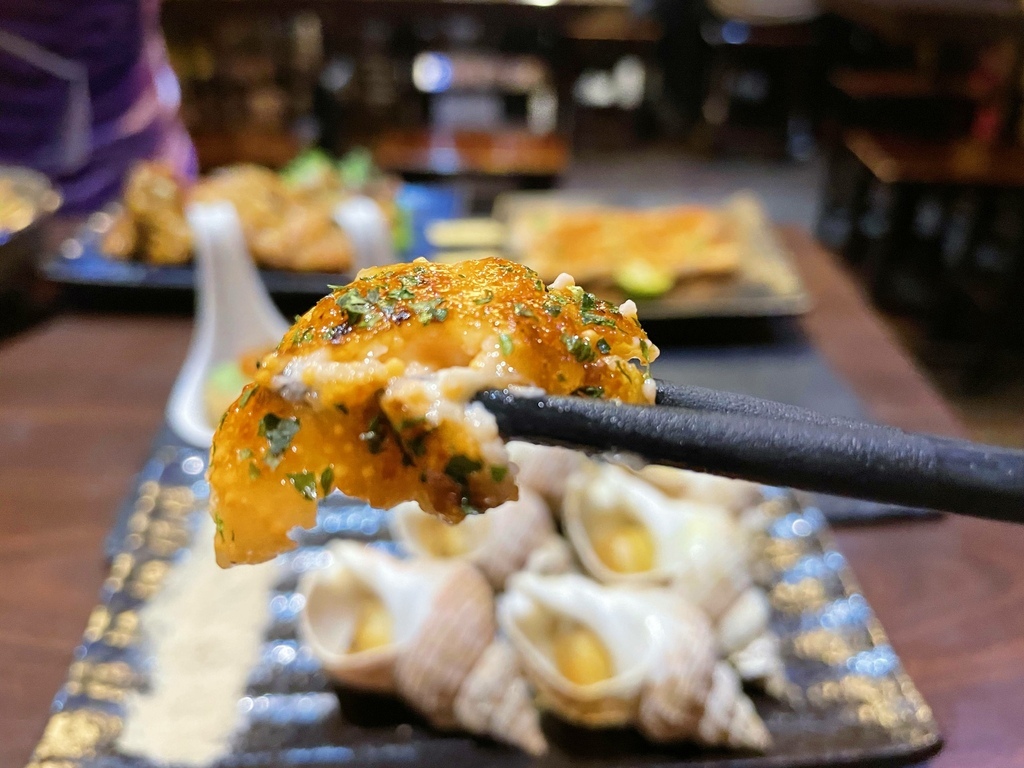↓烤野生海螺$150。一份有六顆,店家擺盤的很用心,把這道海螺拍照上傳根本就是炫耀文。海螺肉看起來相當飽滿,入口之後更是感受到Q彈而鮮甜的口感。提醒一下,這道在菜單上寫的是平日限定,所以週五、六是不提供的。
