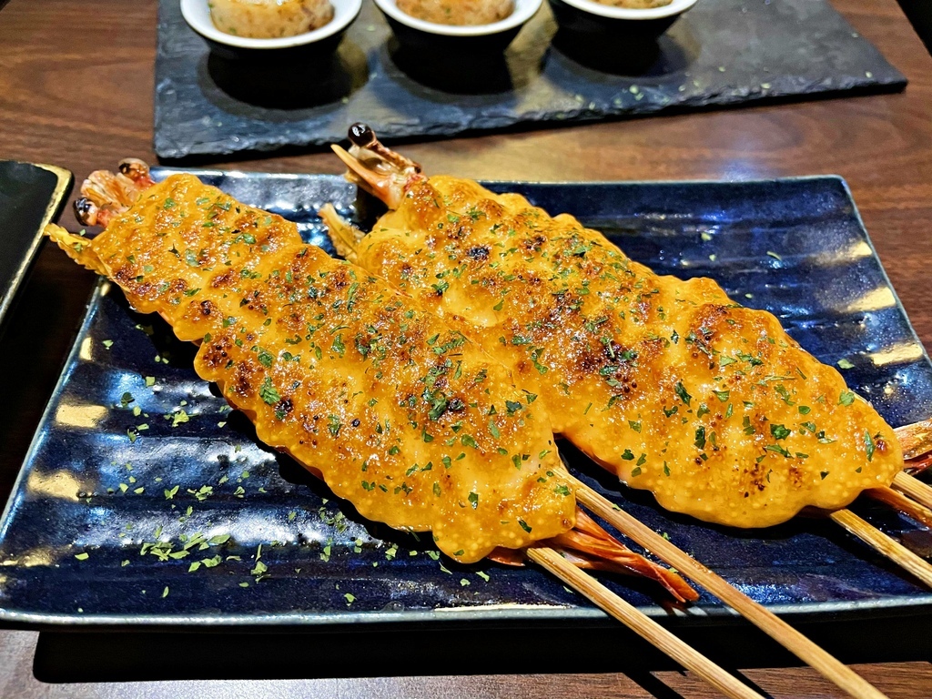 ↓蝴蝶大蝦$260。鋪在上面的這層吃個來有點像龍蝦沙拉的沙拉醬,混和了美乃滋、蝦卵、芥末,能把它平鋪在大蝦上烤,感覺店家很下功夫。