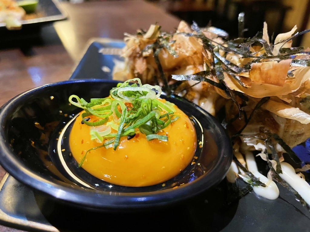 ↓月見柚香雞柳條$150。這道的重點在於上面的那顆生蛋黃,柚香洋蔥雞柳條沾裹著蛋液後,更顯得滑嫩。不過我個人有點排斥柑橘類味道的食物(包含柚子)~所以我無法矯情的說我喜歡這道~