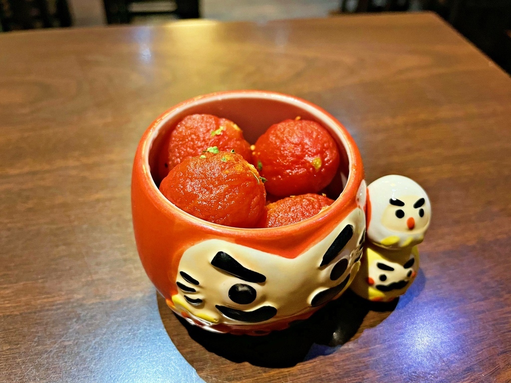 ↓蜜釀番茄$90。去皮的小番茄,在牙齒劃破小番茄之初,感覺到的是番茄本身的酸甜,接著嚼著嚼著,舌頭味蕾及鼻腔慢慢接收到蜂蜜的香與蜜甜,是能感受到層次的一道料理。