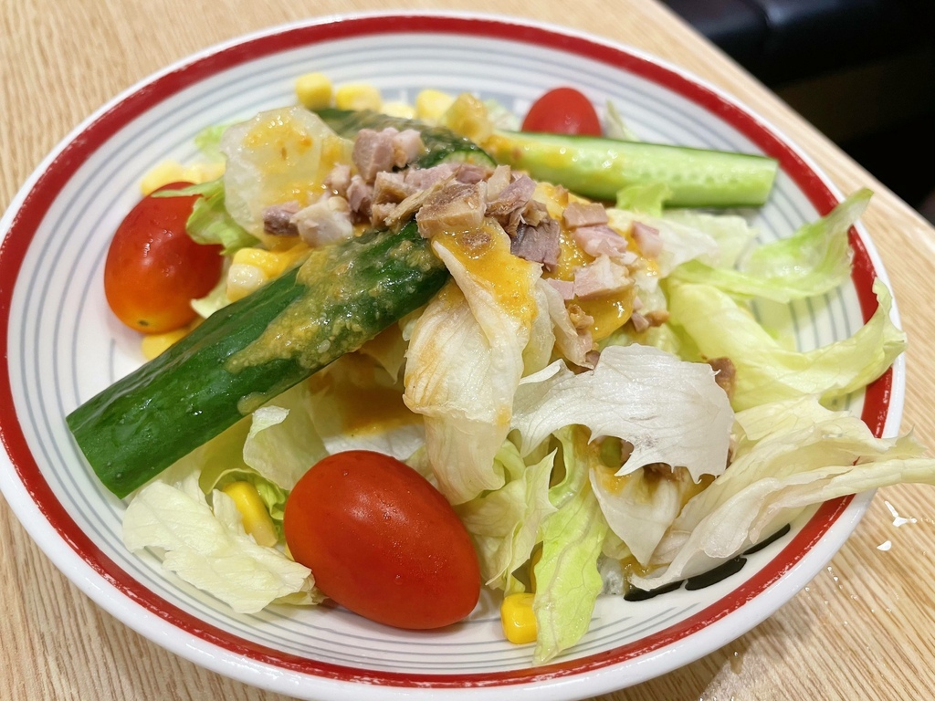 特別要提一下屯京沙拉這道。要是能再選一次的話,我不會點這個,哈哈哈。主要是因為它淋在沙拉上面的醬實在太奇怪了啦,是鹹的肉醬,味道有點像台灣乾麵上面淋的肉醬,搭配生菜吃,口味真的很突兀。蠻想知道是誰堅持要讓它出現在菜單上的。(點擊連結或IG搜尋 旅行阿麥屯京拉麵 留言分享你對這道餐點的感受)