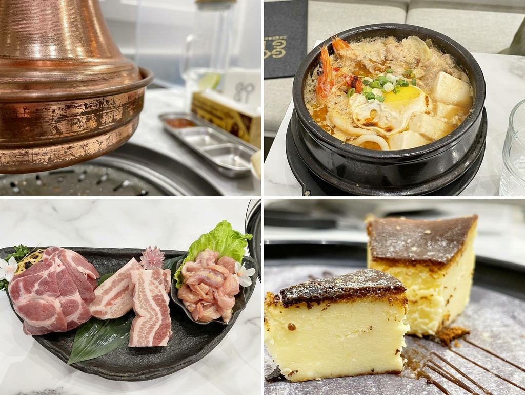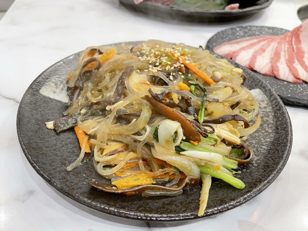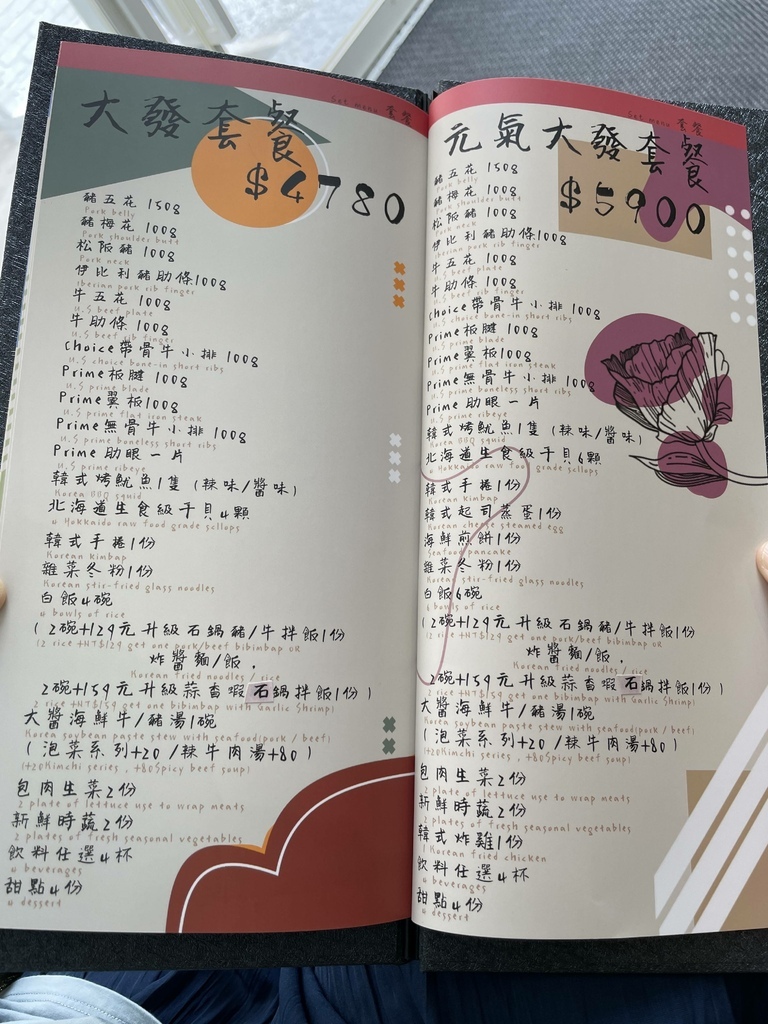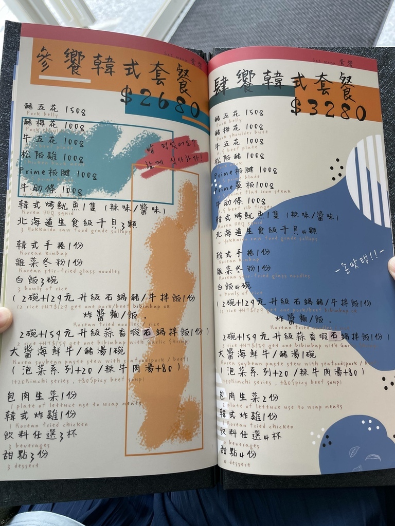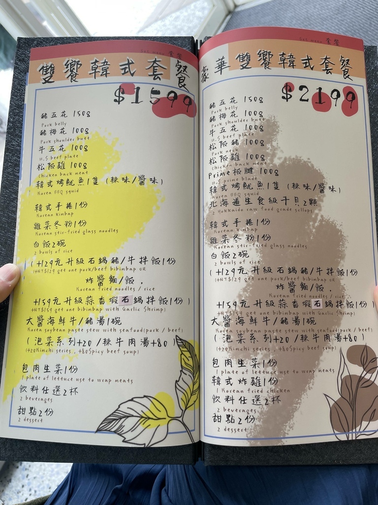 我們當天點的是$1599的雙人套餐,烤肉的部分有豬五花、豬梅花、牛五花、松阪雞、烤魷魚;韓式料理的部分有「韓式手捲」、「雜菜冬粉」、「大醬海鮮牛」;兩碗白飯、一份生菜、飲料兩杯、甜點兩份。