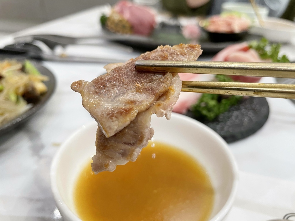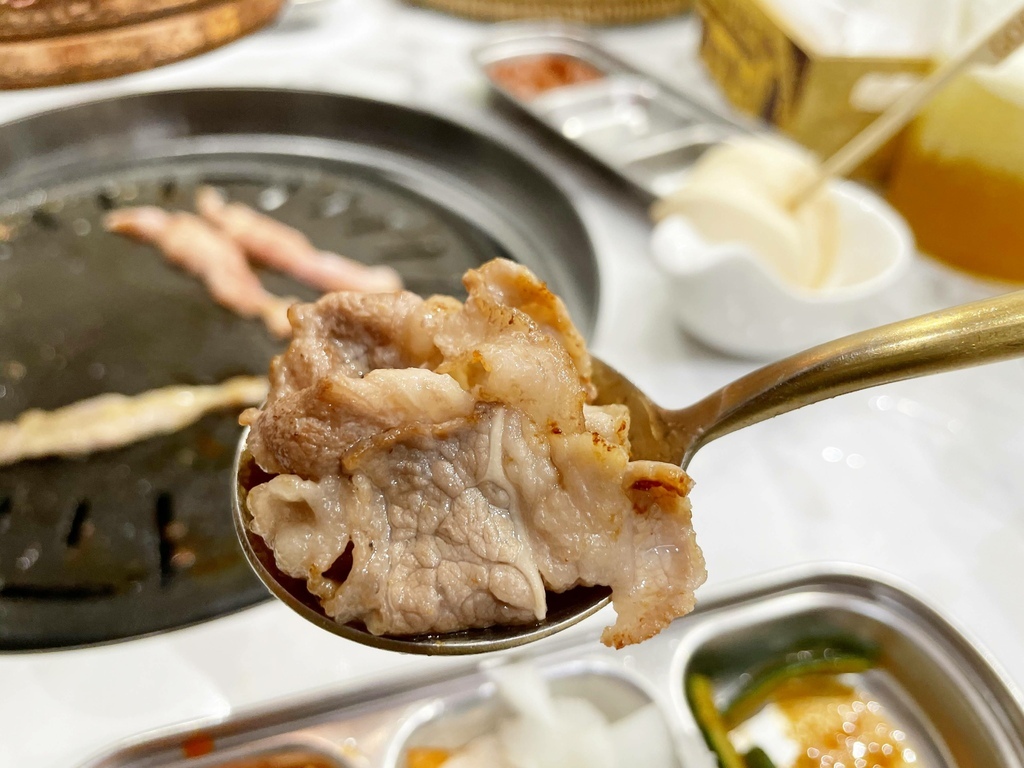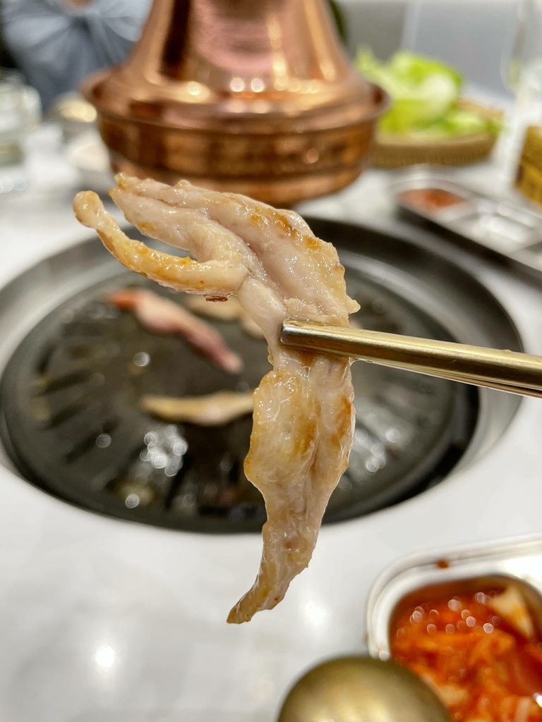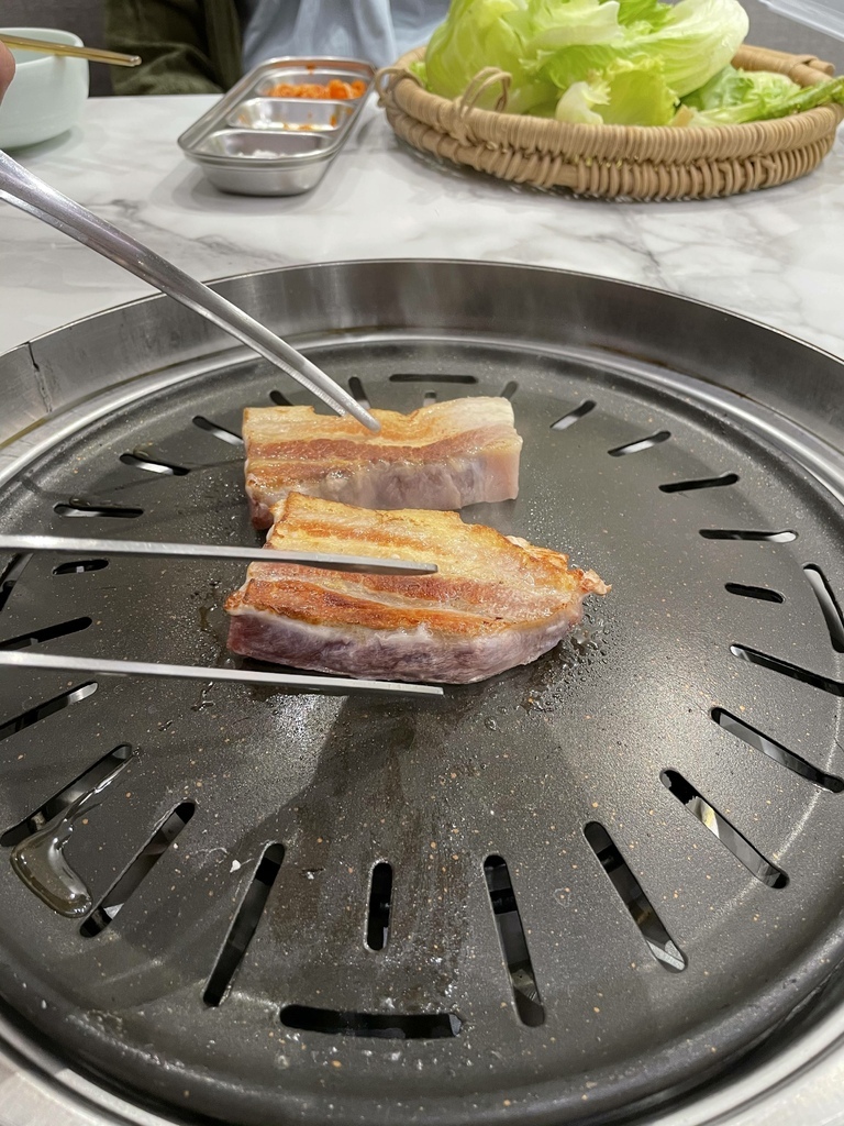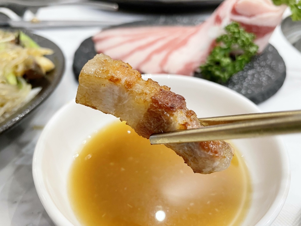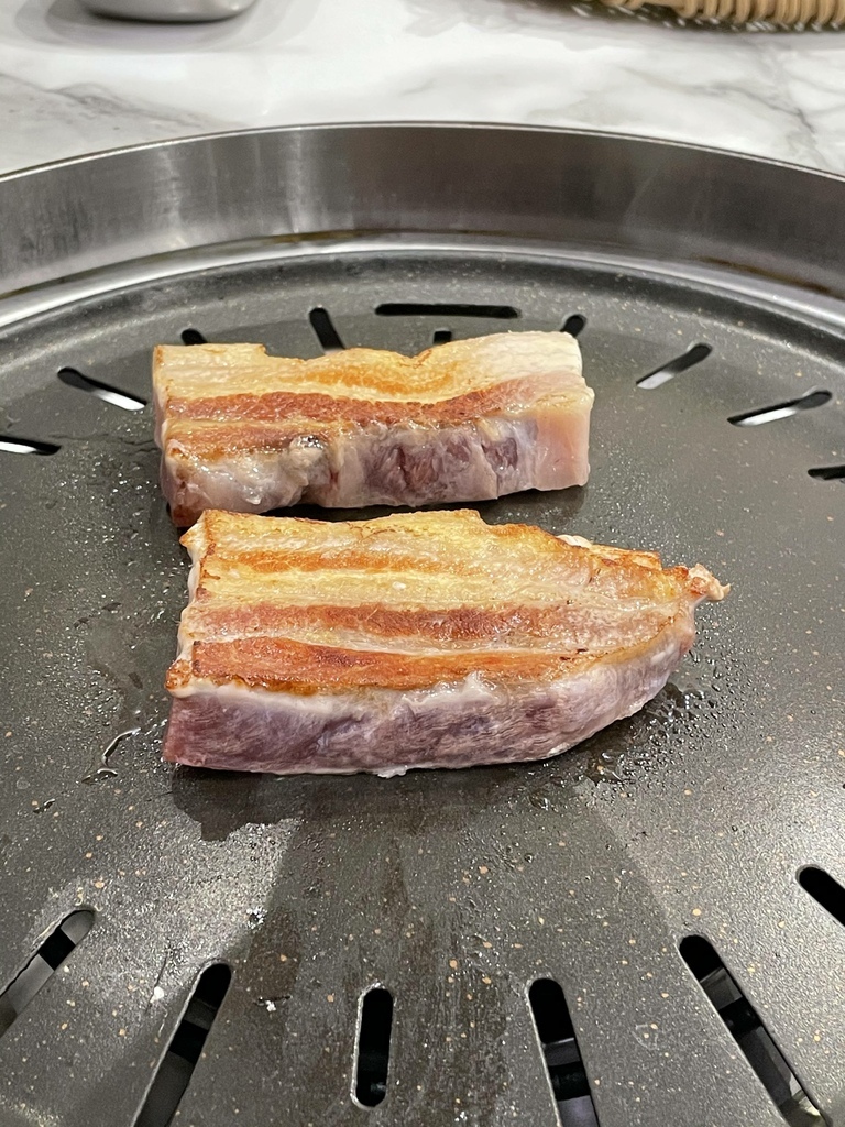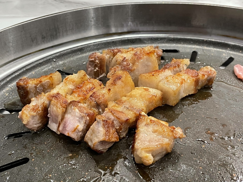 ↓豬五花。烤肉的部分都是店員妹妹幫我們烤的,手法真的比我專業很多,透過火侯的掌控先把五花肉的兩側烤到金黃焦脆,然後剪成條狀後再繼續煎烤,直到肉全熟卻而不焦苦。