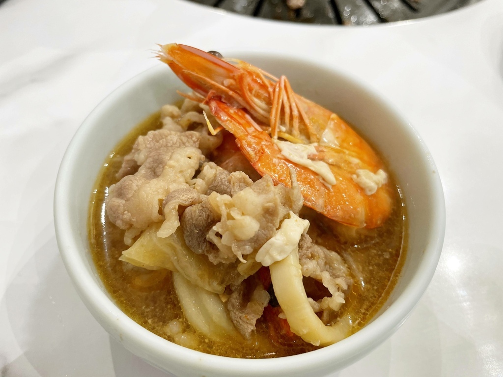 ↓大醬海鮮牛。這道算是我很喜歡的一道,口味很濃很厚很過癮。他用一般的牛肉鍋為基底,裡面放入鮮蝦、花枝等海鮮食材。畫龍點睛的是鮮蝦,濃厚的蝦香在吃的過程中會一直聞到,而且跟沙茶牛肉鍋底融合得很不錯,很對味