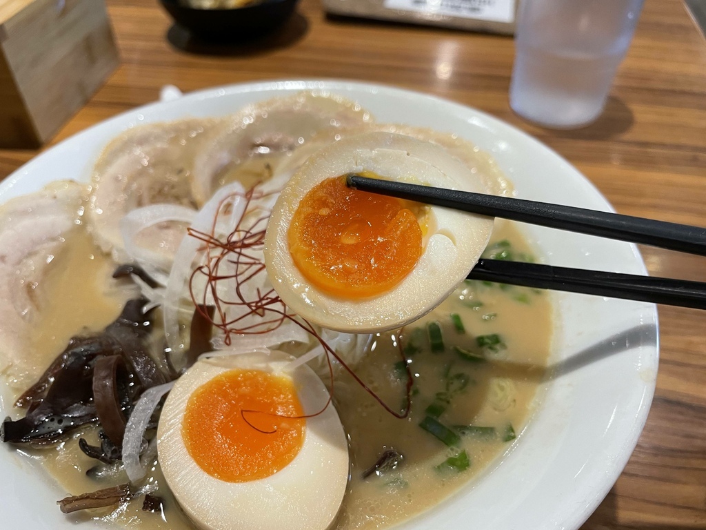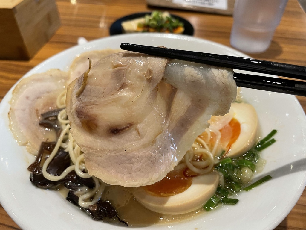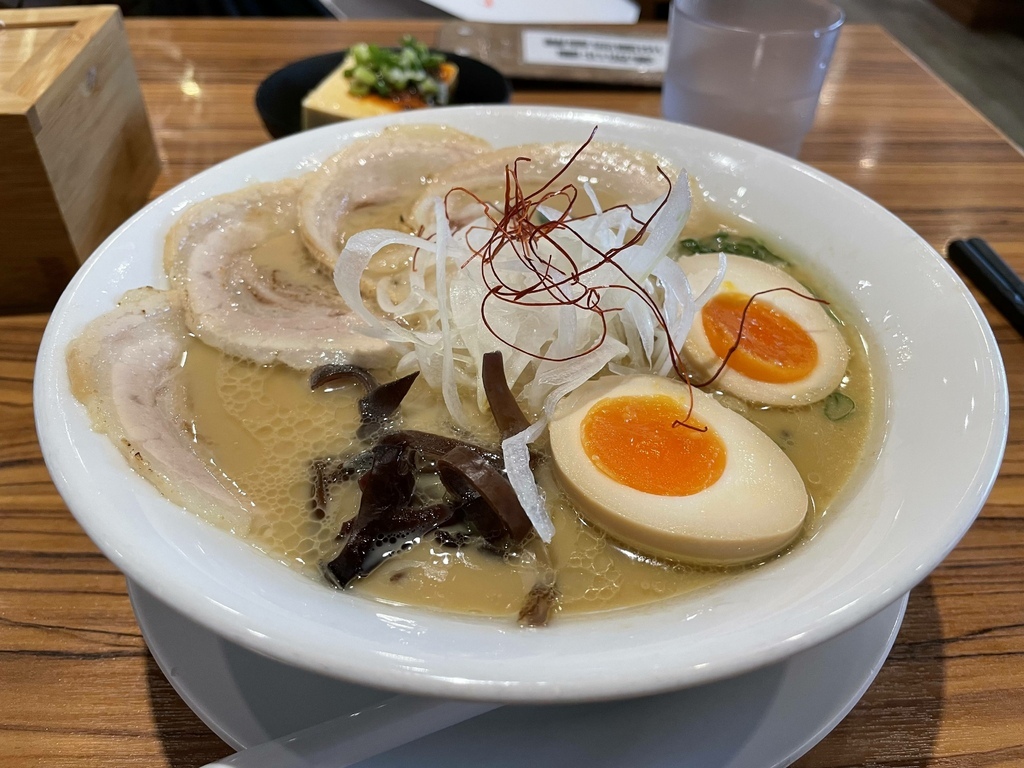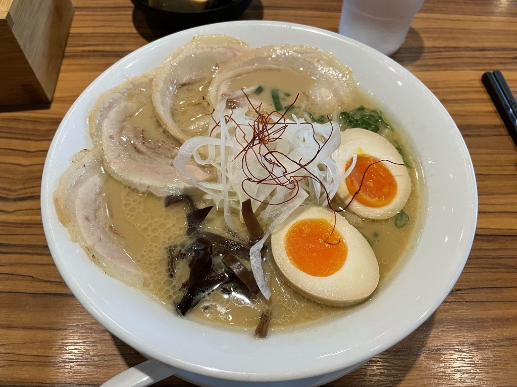 白湯豪華拉麵,單從外觀上來看就是我的菜,我喜歡的元素都在裡面,細麵拉麵、濃的看不透的湯頭、兩個半顆的糖心蛋、三片大大片的叉燒。另外,麵條軟硬度及配菜在點餐的時候都可以事先調整。