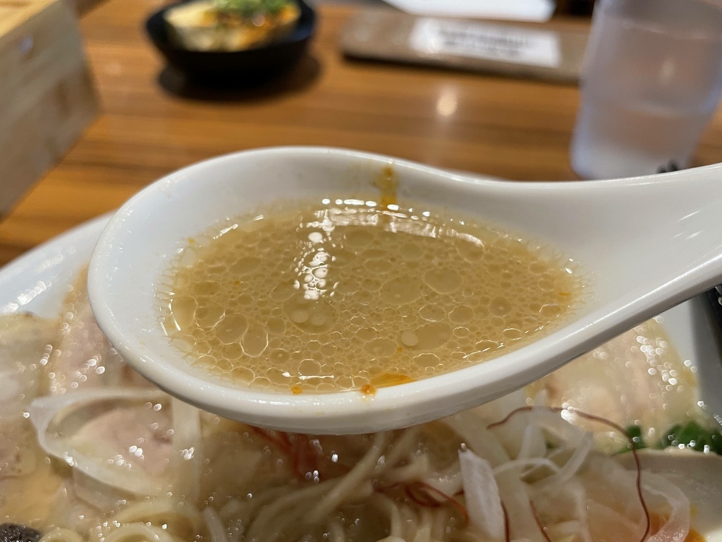 ↓湯頭完全不讓人失望,跟看起來一樣的濃郁,而且喝起來能感覺到濃濃的柴魚味。而此時,拉麵上頭的洋蔥也發揮了效果,濃郁的湯頭搭配清爽的洋蔥,到嘴裡融合出一種多層次的滋味。
