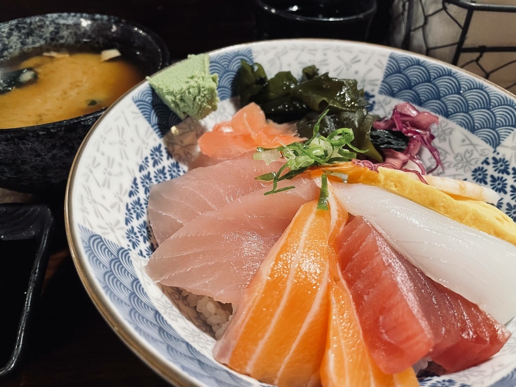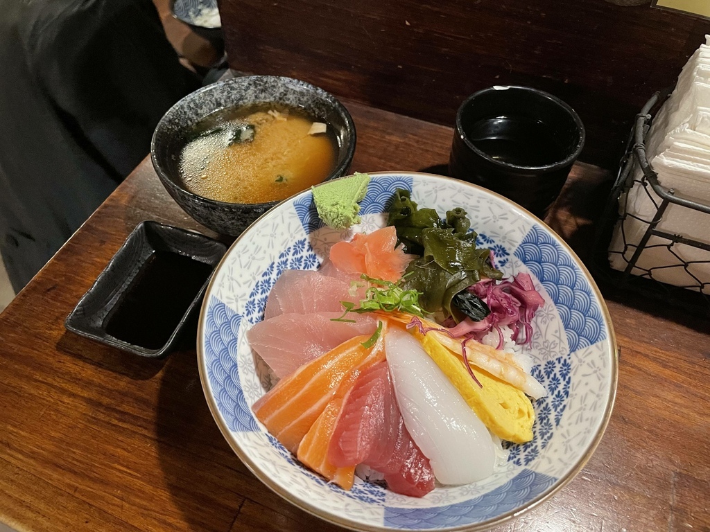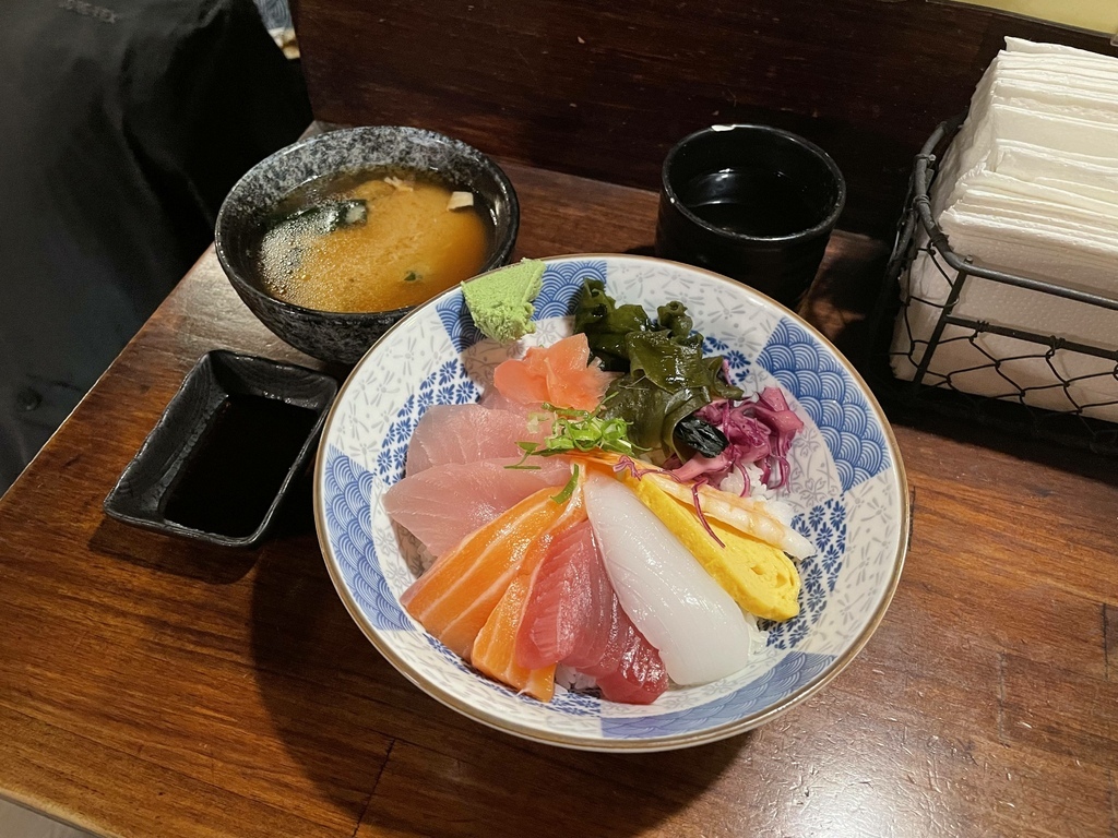 這碗刺身丼裡面有鮭魚、鮪魚及旗魚各兩塊,花枝、玉子燒及蝦各一塊,還有一些紫菜等配菜。